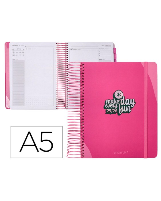 Este curso 2025 -2026 cambia el chip con las nuevas agendas escolares Antartik. Las agendas Antartik son mucho más que simples planificadores: son un manifiesto de que tu personalidad y estilo, diseñadas para almas jóvenes y creativas. Dejate envolver por la energía Antartik y descubre sus distintas Colecciónes y sus combinaciones de colores. Haz que cada día sea divertido y emocionante con la Agenda Escolar Antartik 2025-2026 Fun Day en azul oscuro. Con su lema \"Make every day fun\", esta agenda está diseñada para mantenerte motivado y organizado con estilo. Disponible en formato día página, en un A5+ para que tengas espacio suficiente para detallar tus tareas. Su encuadernación en espiral, a juego con el diseño, la hace funcional además de estética. ¡Descubre toda la