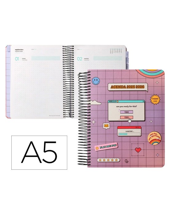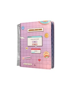 Revive la nostalgia de los años 2000 con la nueva agenda escolar 2025-2026 Liderpapel Pixel . Esta agenda espiralada, disponible en dos diseños únicos, está decorada con icónicos símbolos de ordenador que te harán trasladarte a esa época. Diseñada para los más nostálgios, disponible en formato día página y tamaño A5, ofreciendo un amplio espacio para anotar tareas, eventos y recordatorios. ¡Deja que la nostalgia de los años 2000 te acompañe durante el curso 2025-2026 con la agenda escolar Liderpapel Pixel ! Contiene distintas secciones funcionales para mejorar tu organización personal, como 3 hojas de horarios semanales, tracking de proyectos , exámenes y calificaciones para que no pierdas el hilo de tus logros, y cuenta con páginas de desarrollo personal de objetiv