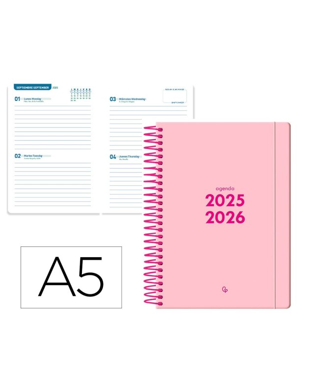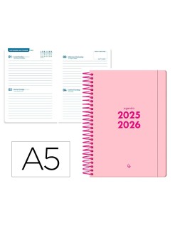 Agenda escolar liderpapel 25-26 espiral basic rosa 2 dias pagina a5 bilingüe papel fsc 70 gr