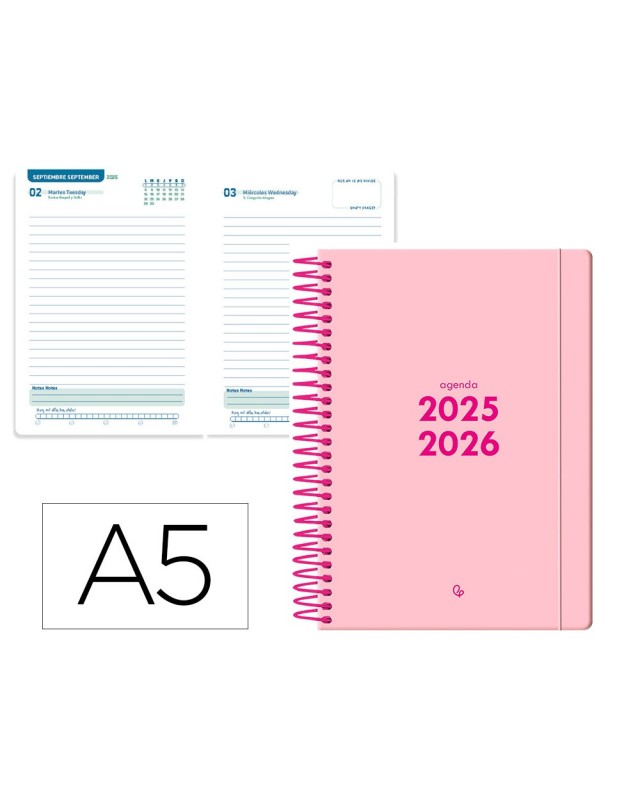 Agenda escolar liderpapel 25-26 espiral basic rosa dia pagina a5 bilingüe papel fsc 70 gr