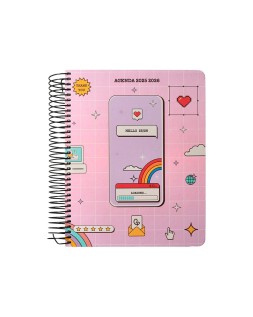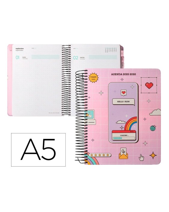 Agenda escolar liderpapel 25-26 espiral pixel rosa dia pagina a5 bilingüe papel fsc 80 gr