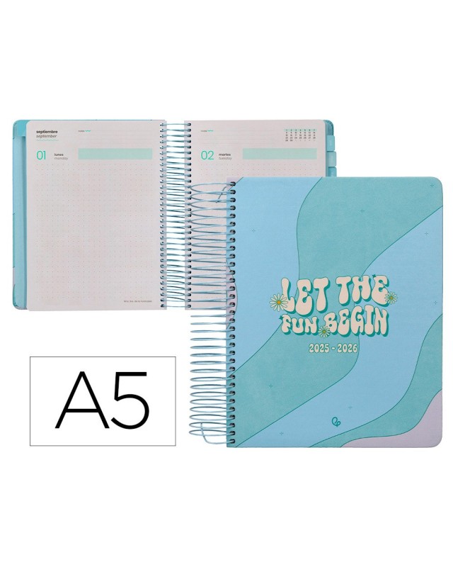 ¡Deja que comience la diversión con la agenda escolar 2025 - 2026 Liderpapel Zante Groovy! Cuenta con una portada con un diseño vibrante en estilo retro, con la inscripción \"Let the Fun Day begin\", diseñada para aportar un toque de nostalgia y alegría a tu planificación diaria. Disponible en ofrmato día página y tamaño A5 y A6, haciéndola el completemento perfecto para acompañarte en cualquier lugar. a encuadernación espiralada facilita la manipulación de las páginas y asegura que la agenda se mantenga abierta y plana para escribir cómodamente. ¡Deja que el estilo retro y la energía positiva te guíen este curso 2025 - 2026! Contiene distintas secciones funcionales para mejorar tu organización personal, como 3 hojas de horarios semanales, tracking de proyectos , exám