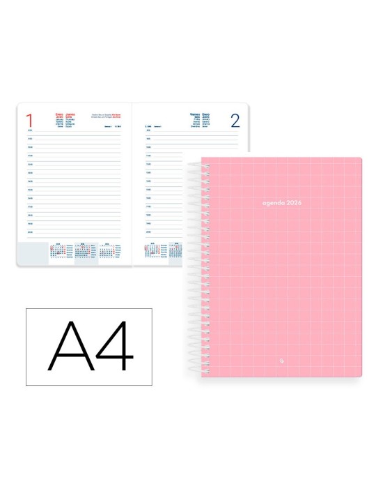 Las agendas Liderpapel Gazi 2026 traen consigo un diseño sencillo y moderno, disponible en cuatro colores: rosa, negro, azul claro y azul oscuro. Cada portada tiene un color sólido de fondo, adornado con líneas blancas que forman un patrón de cuadrados, añadiendo un toque de elegancia a su portada. Son la opción perfecta para quienes buscan una herramienta de organización funcional y con estilo, adecuada tanto para el entorno profesional como personal.El interior incluye: Calendario trienio, Planning Anual, Santoral, Feriados de España y Portugal, Distancias kilométricas entre ciudades europeas, Mapas de usos horarios, Contactos. Sabado y Domingo en diferente página. CARACTERISTICAS: AGENDA ESPIRAL LIDERPAPEL AÑO 2026, DIA PAGINA, A4, POLIPROPILENO, FLEXIBLE, PAPEL 70G FSC, COL