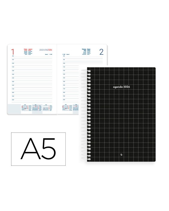 Las agendas Liderpapel Gazi 2026 traen consigo un diseño sencillo y moderno, disponible en cuatro colores: rosa, negro, azul claro y azul oscuro. Cada portada tiene un color sólido de fondo, adornado con líneas blancas que forman un patrón de cuadrados, añadiendo un toque de elegancia a su portada. Son la opción perfecta para quienes buscan una herramienta de organización funcional y con estilo, adecuada tanto para el entorno profesional como personal.El interior incluye: Calendario trienio, Planning Anual, Santoral, Feriados de España y Portugal, Distancias kilométricas entre ciudades europeas, Mapas de usos horarios, Contactos. Sabado y Domingo en diferente página. CARACTERISTICAS: AGENDA ESPIRAL LIDERPAPEL AÑO 2026, DIA PAGINA, A5, POLIPROPILENO, FLEXIBLE, PAPEL 70G FSC, COL