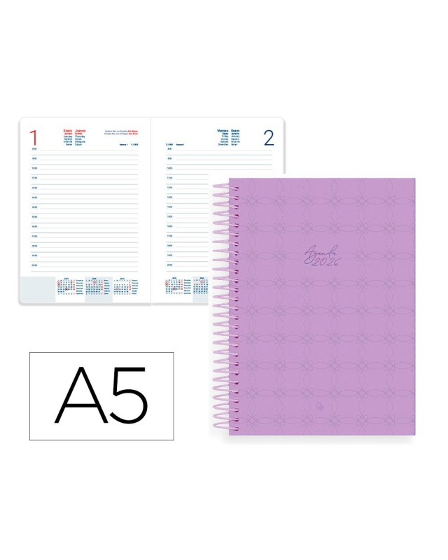 Las agendas Liderpapel Perissa 2026 cuentan con un diseño básico y elegante, disponible en cuatro colores: verde, rosa, morado y azul. Cada portada está adornada con un patrón de rombos que le aporta un toque distintivo y sofisticado. Este diseño sencillo pero atractivo es ideal para quienes buscan una herramienta de organización funcional y con estilo, adecuada tanto para el entorno profesional como personal.El interior incluye: Calendario trienio, Planning Anual, Santoral, Feriados de España y Portugal, Distancias kilométricas entre ciudades europeas, Mapas de usos horarios, Contactos. Sabado y Domingo en diferente página. CARACTERISTICAS: AGENDA ESPIRAL LIDERPAPEL AÑO 2026, DIA PAGINA, A5, CARTON FORRADO, RIGIDA, PAPEL 80G FSC, COLECCION PERISSA