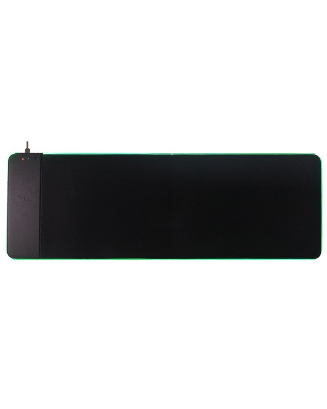 Alfombrilla gaming XXL con iluminación RGB en los bordes y base de carga inalámbrica. Alimentación por cable USB. Permite revisar y cargar su teléfono móvil de forma sencilla al mismo tiempo que utiliza el ordenador durante sus partidas. Su material permite un deslizamiento rápido y preciso del ratón, apto para todo tipo de sensibilidades. Color negro. Tamaño de la alfombrilla: 800 x 300 x 4 mm.