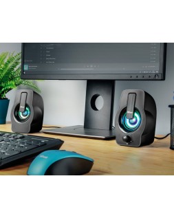 Conjunto de altavoces compacto y elegante para complementar los equipos domésticos o de oficina. Con una potencia máxima de 12 W (6 W RMS). Garantiza un sonido claro y ocupa poco espacio en el escritorio. El Gemi funciona con cualquier PC o portátil y se alimenta por USB, lo que significa que los altavoces se pueden instalar muy fácilmente. No es necesario disponer de una toma de pared. Una vez conectados, los altavoces se iluminan con un ciclo de color RGB automatizado. Los altavoces se pueden encender o apagar, así como ajustar el volumen con el botón integrado en la parte delantera. Medidas: 85 x 132 x 95 mm. Peso: 401 g.
