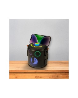 Equipo de sonido portátil todo-en-uno para fiestas, aulas o talleres de expresión oral. Amplificación de 15 W con ecualizador, luces LED sincronizadas y soporte superior para smartphone/tablet (ideal para apps de karaoke).Incluye DOS micrófonos inalámbricos para duetos y asa integrada para tran sporte. Conectividad Bluetooth 5.4, puerto USB y lector de tarjetas.