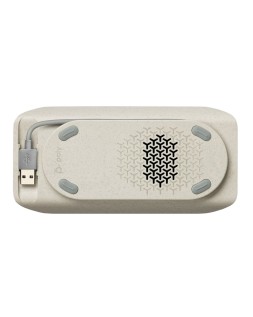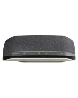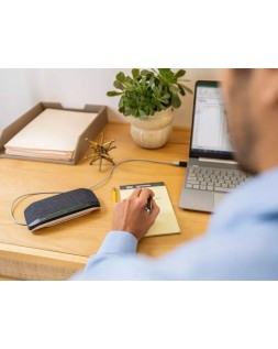 Altavoz manos libres todo en uno. Ofrece un audio excelente para llamadas de voz, videoconferencias, seminarios web y podcasts, además de música de alta calidad. Dos micrófonos reducen el ruido. El audio full dúplex permite mantener conversaciones simultáneas. Cuenta con conectividad USB-A o USB-C plug-and-play. Luces LED y barra de luz altamente visibles que permiten ver el estado de las llamadas desde toda la sala. Resistente al polvo y al agua. Medidas: 182 x 32,5 x 89,5 mm. Peso: 300 g.