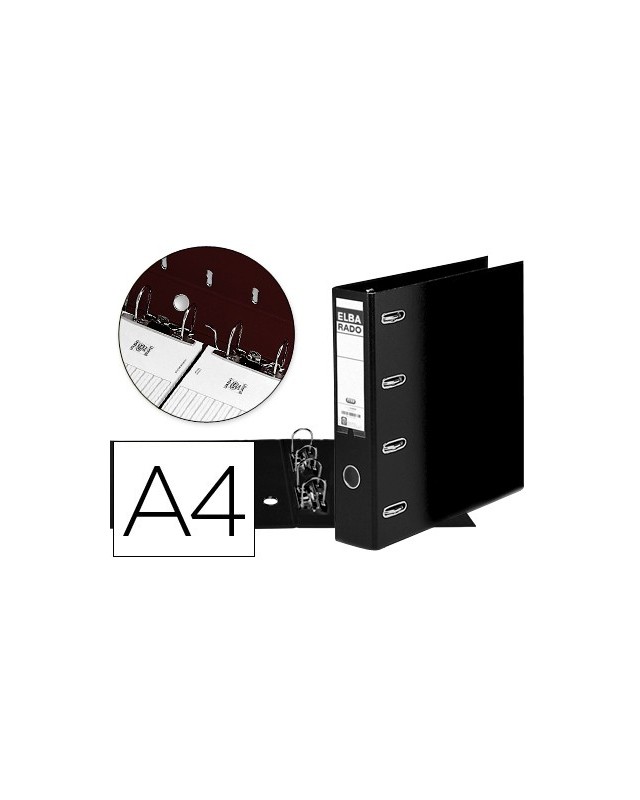 Archivador fabricado en cartón forrado con papel tratado, con dos mecanismos independientes de 2 anillas de 70 mm cada uno (total 4 anillas). Lomo de 75 mm con etiqueta. Ideal para archivar documentos DIN A5 ahorrando espacio en un archivador DIN A4. Color negro. Formato DIN A4. Medidas: 290 x 320 mm.