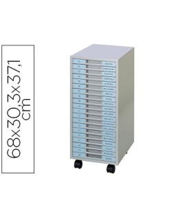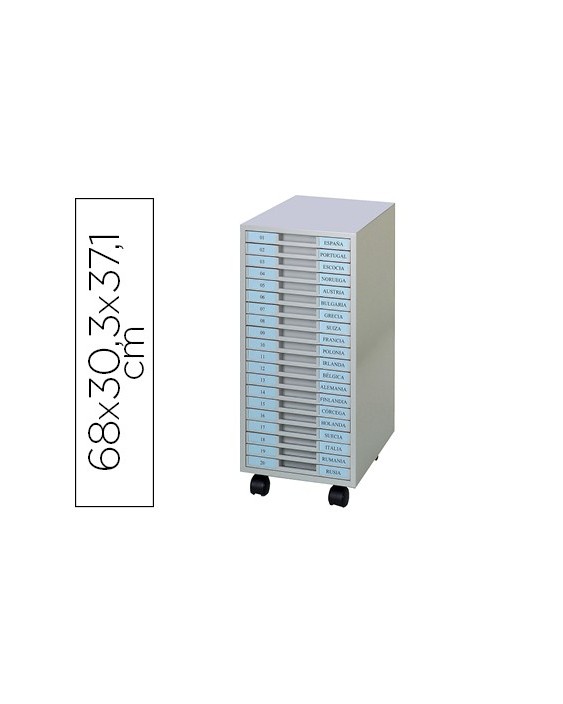 Armario metálico de gran resistencia con bandejas de poliestireno de alto impacto, pintado con pintura epoxi. Medida útil de la bandeja (ancho x alto x fondo): 5,5 x 25 x 33,5 cm. Quitando las ruedas se pueden apilar hasta 3 muebles sin problema. Incorpora unas muescas en la parte superior e inferior del mueble para poder apilarlos. Es ideal para todo tipo de impresos, catálogos, folletos, en definitiva cualquier documentación en general. El acabado artesanal hace que sus paredes puedan soportar más de 200 kilos de peso. Incluye etiquetas blancas.MEDIDAS CON RUEDAS: 30,3 X 68 X 37,1 CM