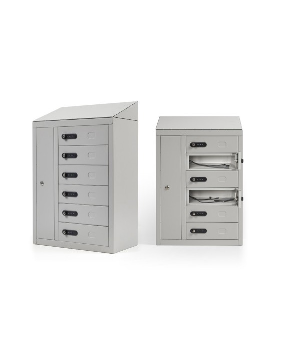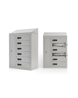 Armario para almacenamiento de móviles. Apto para colegios y centros públicos. Capacidad máxima para 32 móviles. Colocación vertical. Armario preparado para anclar en la pared. Practicable por una cara. Fabricado con chapade 0,8 mm y pintado en pintura epoxi. Posibilidad de dos tipos de cierre. Cerradura con llave o cerradura de combinación horizontal. Color de acaba do gris.