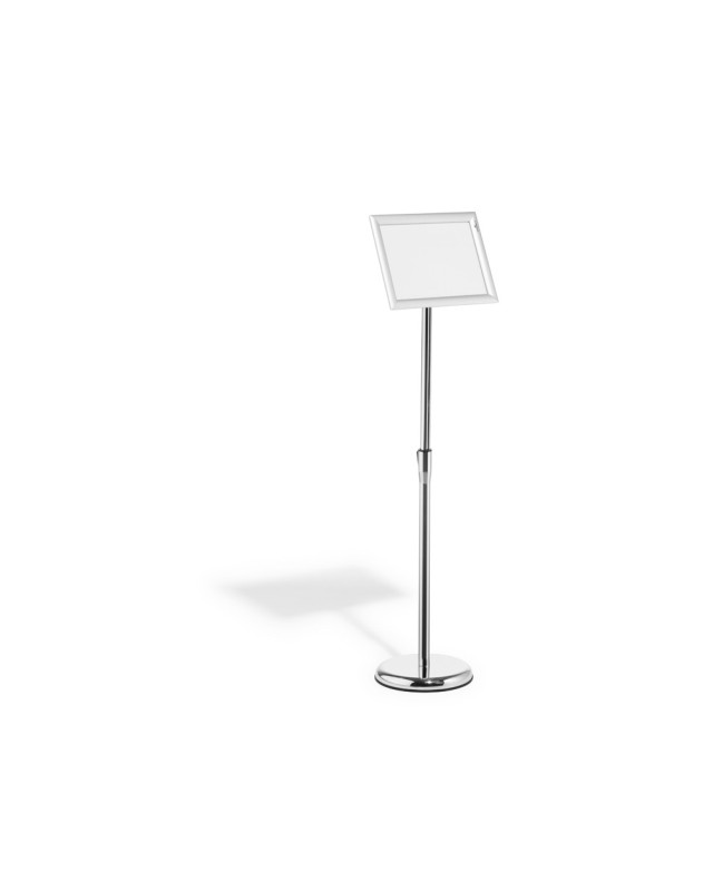 Soporte informativo de montaje rápido con robusto bastidor plegable de aluminio Din A4, anodizado en plata. Se puede garantizar una gran estabilidadrellenando opcionalmente la base (diámetro: 250 mm) con arena. Artículo d e compra adicional Durable Sand Art. Nº 3335-16, peso máx. aprox. 1,1 kg. Base redonda con anillo de goma que evita arañazos en el suelo. Altura ajustable con barra telescópica (se puede ajustar en pasos desde 770 mm hastauna altura máxima de 1.205 mm en formato vertical). Marco plegable que pu ede girarse fácilmente de formato vertical a horizontal. Ángulo de lecturaajustable. Lámina protectora de baja reflexión y resistente a los rayos U V. Panel posterior de poliestireno resistente a los golpes. Esquinas redondondeadas. Ideal para gastronomía, comercios,