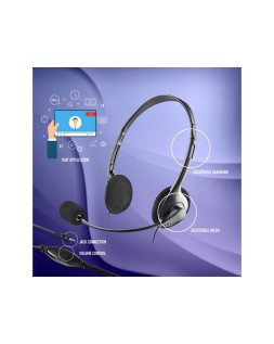 Auriculares ligeros para portátil. Micrófono ajustable y sensible que garantiza la nitidez de la voz. Diadema ajustable. Control de volumen. Apto para aplicaciones de vídeo y de chat. 1 conexión de audio de 3,5 mm + adaptador a doble jack 3,5 mm. 1,5 m de cable.