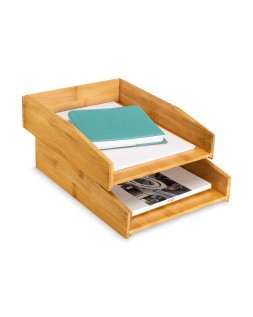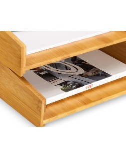 Ideal para el teletrabajo o en la oficina para un archivo rápido y eficaz.Diseño elegante y escandinavo para un ambiente agradable. Apilamiento ver tical o en escalera. Una de las dos bandejas está equipada con almohadillas antideslizantes para proteger su espacio de trabajo. El barniz protectorhace que el producto sea impermeable. No contiene clavos ni tornillos. Ma terial: Bambú 100% natural. Medidas: 34 x 25,2 x 7,5 cm. Peso: 1,8 kg. Reciclable. Tenga en cuenta que los productos de bambú pueden presentar comúnmente diferencias naturales en los tonos de color.