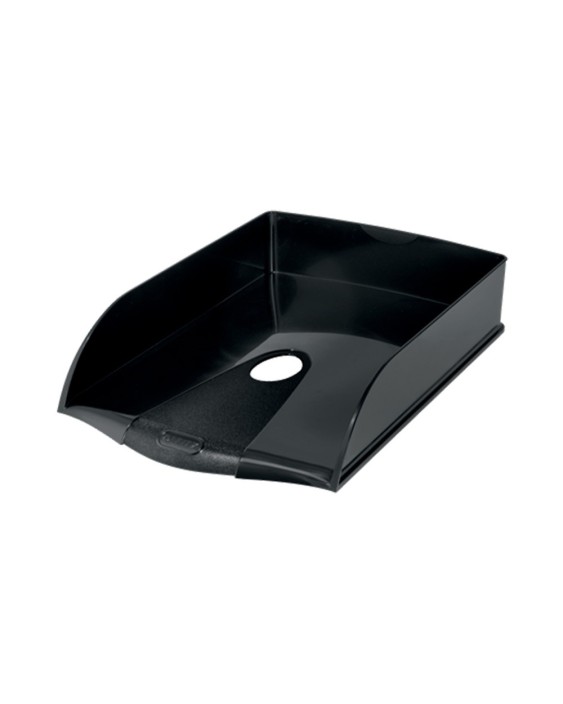 Fabricada con 98% plástico reciclado y 100% reciclable. Puede apilarse verticalmente o de forma escalonada. Abertura frontal amplia para acceder fácilmente a los documentos incluso apilada. Apta para DIN A4 y carpetas. Color negro. Medidas: 255 x 60 x 328 mm.