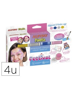 SET ALPINO DE MAQUILLAJE LÍQUIDO. MAQUILLAJE LIQUÍDO CON BASE AGUA DE TEXTURA SUAVE Y LIGERA. EL SET INCLUYE 4 COLORES (AZUL, ROSA, DORADO Y PLATEADO), UN PINCEL, UNA LÁMINA DE TATUAJES Y UNA GUÍA DE IDEAS. MAQUILLAJE LISTO PARA USAR, NO NECESITA BASE MAQUILLAJE NI CREMA HIDRATANTE. ES UN PRODUCTO COSMÉTICO LIBRE DE PRINCIPALES ALÉRGENOS. MAQUILLAJE PARA FIESTAS. USO INFANTIL Y ADULTO.
