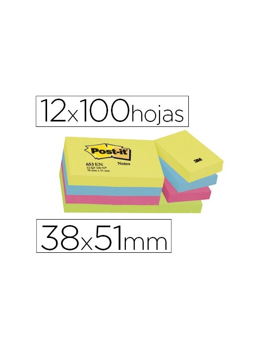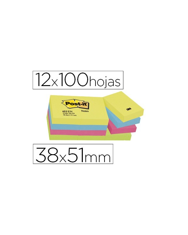 Bloc de notas adhesivas quita y pon post-it 38x51 mm neon pack de 12 blocs surtido