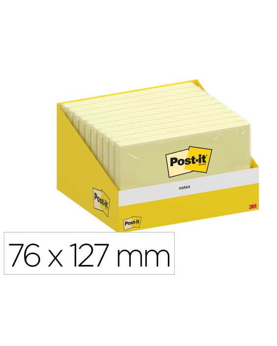 Bloc de notas adhesivas quita y pon post-it 76x127 mm con 100 hojas. Retractilados individualmente. Recomendables para escribir datos. Color amarillo canario. Las notas Post-it están elaboradas con fibras de papel con certificación PEFC procedentes de explotaciones sostenibles y orígenes controlados. El embalaje está hecho de cartón reciclado y puede usarse para guardar fácilmente las notas adhesivas y se puede reciclar cuando ya no se necesite.