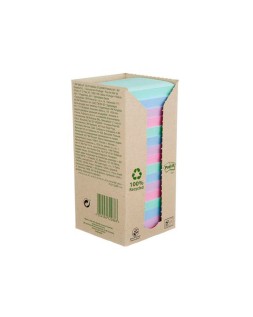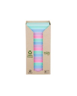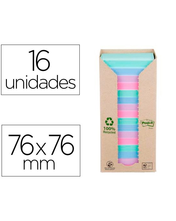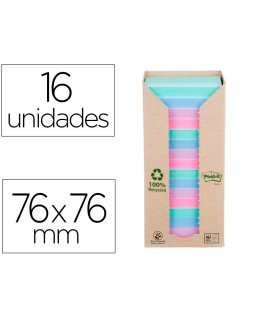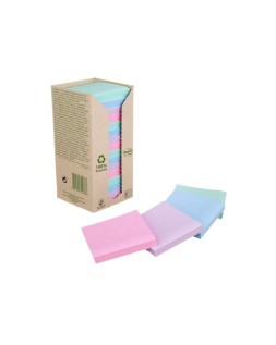 Las notas recicladas Post-it están fabricadas 100 % con fibras de papel reciclado y un adhesivo de fuentes renovables, fabricado al 60 % con plantasque vuelven a crecer cada año. Tienen la certificación PEFC RECYCLED, se obtienen de bosques certificados, renovables y gestionados responsablemente. Torre con 16 blocs. 100 hojas. Colores surtidos. Medidas: 76x76 mm.