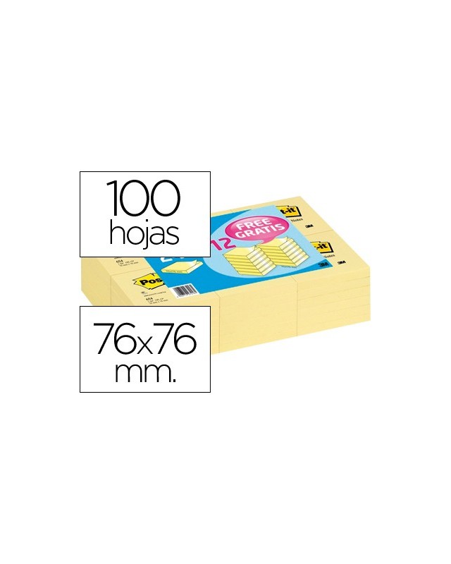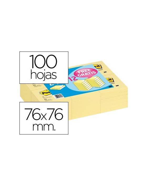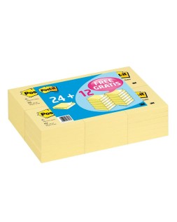 Bloc de notas adhesivas quita y pon post-it 76x76 mm pack promocional 24+12 unidades
