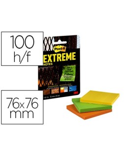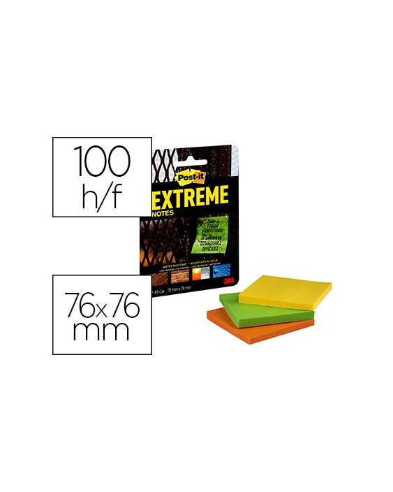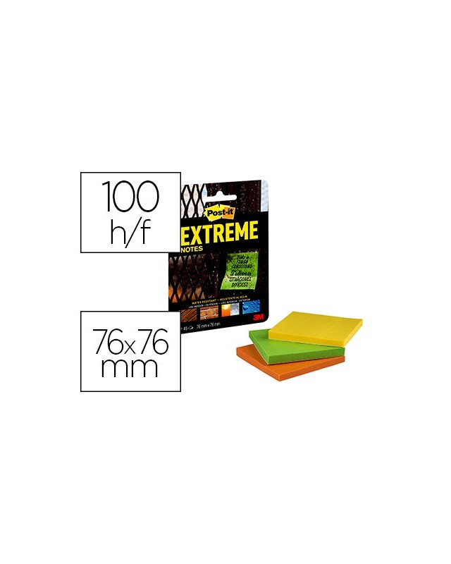 Bloc de notas adhesivas de quita y pon. Pega sobre superficies rugosas incluso en las condiciones más difíciles. Resistentes al agua. Se pueden usar en interior o exterior, en entornos fríos y cálidos. Colores: amarillo, naranja y verde. Medidas: 76 x 76 mm. 45 hojas.