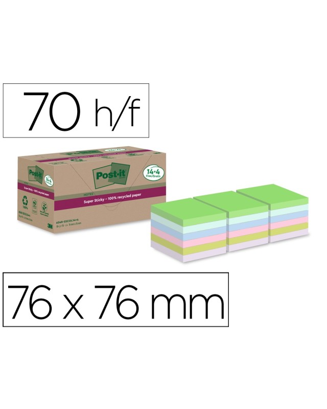 Bloc de notas adhesivas quita y pon post-it super sticky 76x76 mm 70 hojas recicladas paquete de 14 unidades