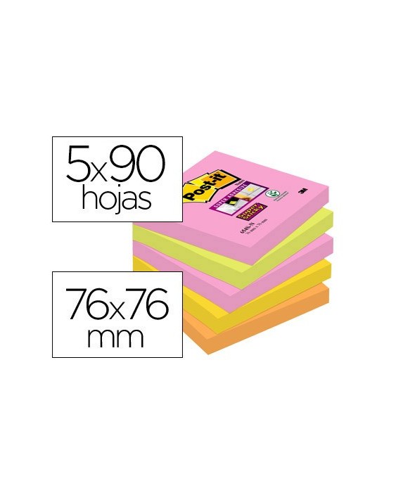La nota que más pega. Superadhesiva. Especialmente indicadas para superficies verticales, rugosas o de difícil adherencia. Colores Cape Town: amarillo, naranja rosa y verde neón. No encelofanados individualmente. 90 hojas. Medidas: 76 x 76 mm.El pack de 5 blocs.