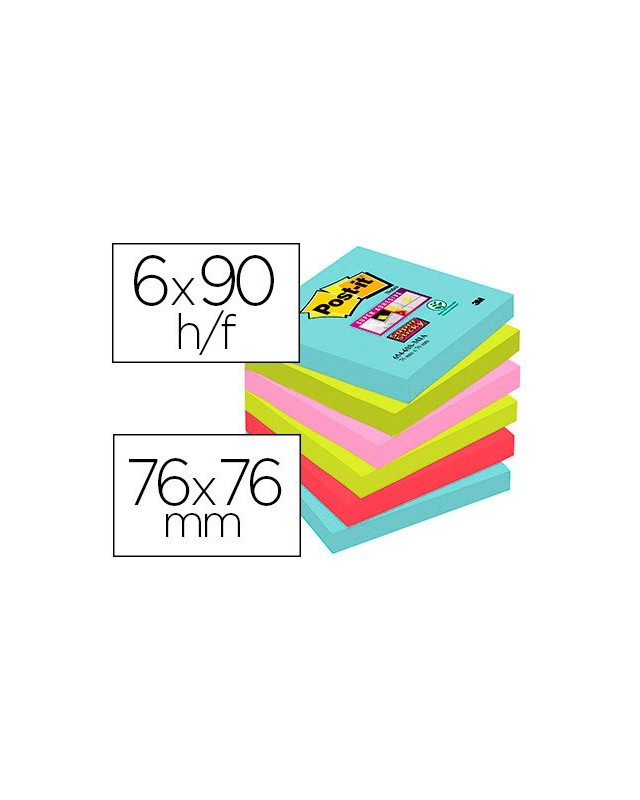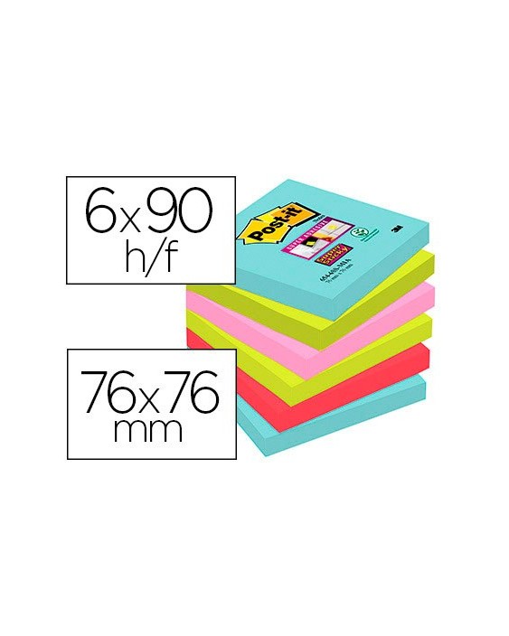 La nota que más pega. Superadhesiva. Pega más, durante más tiempo y sobre más superficies. Versátil y llamativa. Perfectas para superficies verticales o de difícil adherencia. Colores Miami: amapola, ola marina, rosa neón y verde neón. 90 hojas. El pack de 6 blocs.
