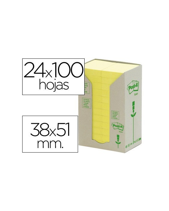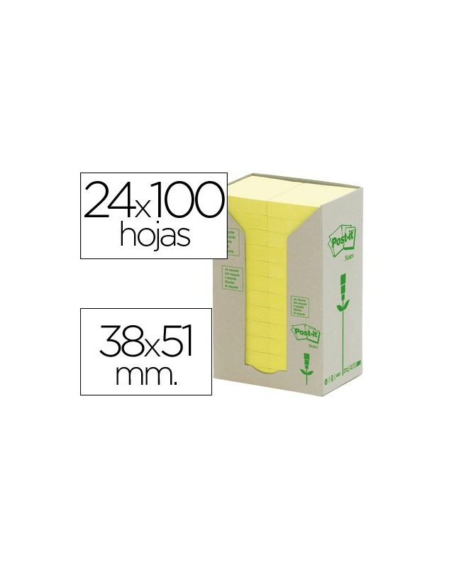 Notas producidas con fibra de papel reciclado. Cartón sin lejías ni colorantes. Dispensador con diseño ecológicamente eficiente. Utilización de un único color de tinta para un proceso de destintado más sencillo. Presentación en torre. Color amarillo. El bloc de 100 hojas.