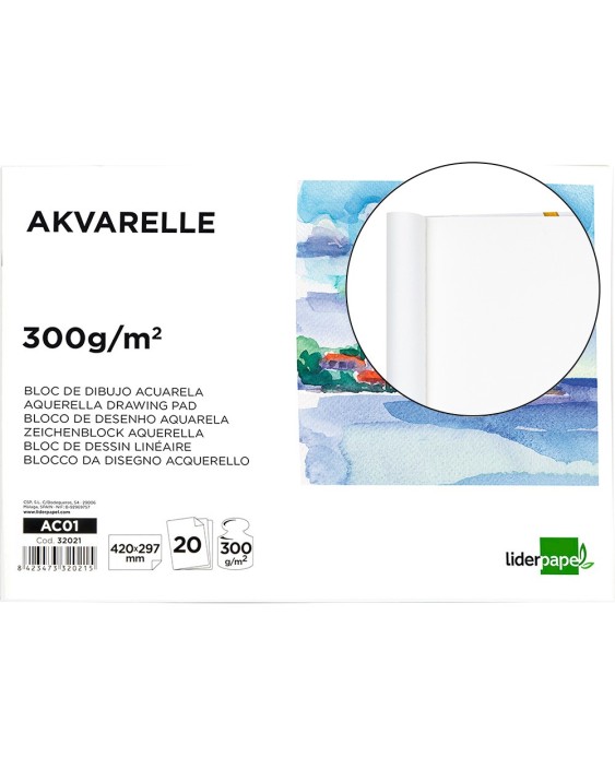 Bloc dibujo liderpapel acuarela encolado 297x420mm 20 hojas 300g m2 sin recuadro