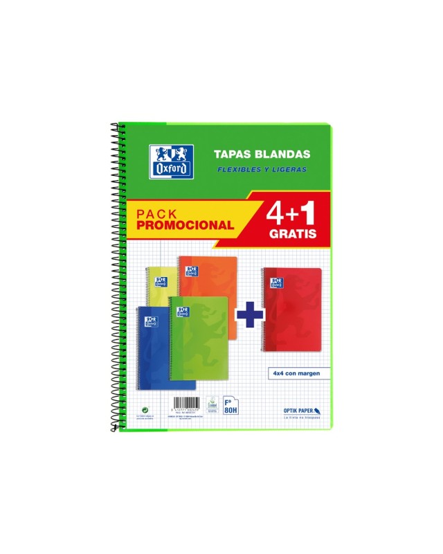 Bloc espiral oxford tapa blanda folio 80 hojas 90gr cuadro 4 mm colores vivos pack de 4+1
