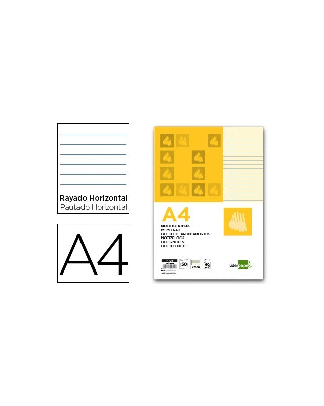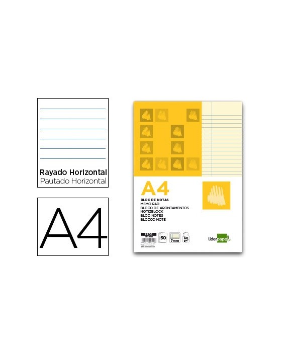 Bloc notas liderpapel encolado a4 rayado horizontal 50 hojas 80 gr color amarillo