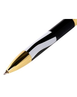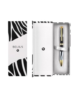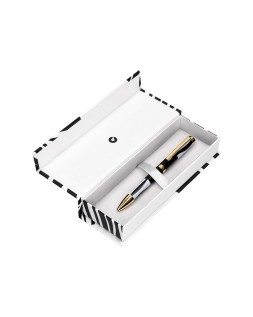 El bolígrafo Dualità combina un diseño moderno y atrevido, con un cuerpo en color negro decorado con trazos estilo cebra en blanco y detalles metálicos dorados. Viene presentado en una moderna caja de cierre magnético que juega con la inversión de colores, incorporando una solapa interior en contraste. El diseño en blanco y negro invertidos representa el contraste y la dualidad presentes en la juventud, capturando su energía. La colección se caracteriza por su diseño elegante, contemporáneo con un estilo único. Cada detalle ha sido cuidadosamente elegido para crear un impacto visual fuerte y llamativo. Tinta color azul. Grosor tamaño 1 mm.
