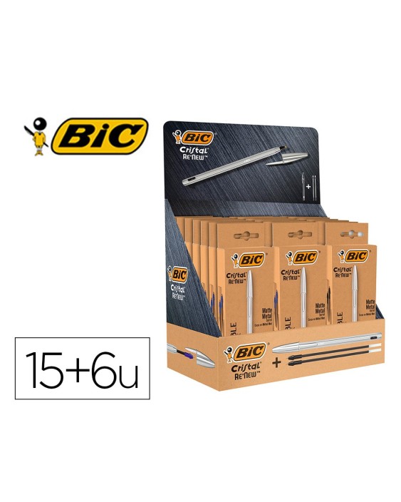 EXPOSITOR COMPUESTOS POR 21 ESTUCHES DE BOLIGRAFO METALICO + 2 RECARGAS. 15 ESTUCHES DE COLOR DE LA TINTA AZUL Y 6 ESTUCHES DE COLOR DE LA TINTA NEGRO.CUERPO METALICO COLOR MATE PARA UN ASPECTO ÚNICO Y ELEGANTE. CAPUCHON FABRICADO CON UN 96% DE PLASTICO RECARGABLE.EN UNA CAJA TIENES HASTA 9KM DE ESCRITURA.VERSION METALICA DEL ICÓNICO BIC CRISTAL.