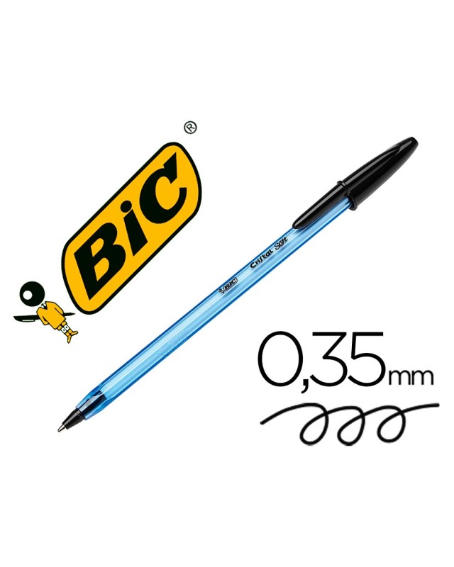 Bolígrafo con tinta más suave gracias al sistema de tinta Easy Glide que aporta un 35% más de suavidad en la escritura. Tinta a base de aceite. Cuerpo transparente en azul claro. Tapón y capuchón del color de la tinta. Punta cónica gruesa 1,2 mm. Trazo: 0,35 m.