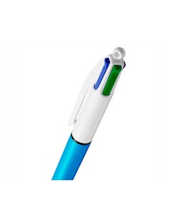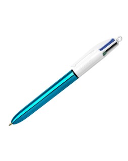 Bolígrafo 4 colores. Diseño moderno con cuerpo en colores metálicos surtidos. Permite corregir, marcar o diferenciar un texto con sólo pulsar el color de tinta elegido. Tinta de calidad, de secado rápido y una escritura suave. Sistema para correa. Producto libre de PVC. Punta media de 1 mm. Trazo 0,32 mm.
