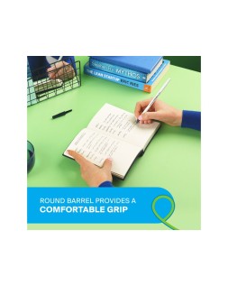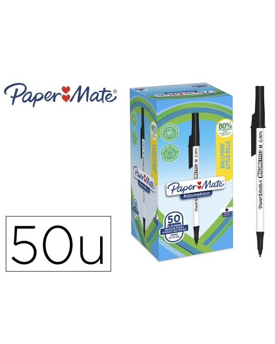 Bolígrafos Paper Mate Kilométrico. Escritura Larga con punta mediana (1,0 mm). Tinta negra. 80% plástico reciclado. Caja 50 unidades. Fabricados en un 80% con plásticos reciclados, los bolígrafos Paper Mate Kilométrico ofrecen una escritura fiable y suave y son ideales para todo tipo de situaciones de escritura. Disponibles en tinta negra, azul y roja con una punta mediana de 1,0 mm, la tinta fuerte destaca para causar una impresión firme yprofesional.