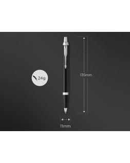 La gran familia IM de Parker se caracteriza por su diseño sobrio y su excelente relación calidad-precio, siendo una colección de plumas, rollers y bolígrafos fiables, cuidados en cada detalle e ideales para su uso diario. Con las nuevas IM Essential, Parker añade a la familia IM dos acabados, hechos con los mismos materiales y siguiendo los mismos estándares de calidad de Parker IM, pero con un precio más asequible. IM Essential es el puntode entrada en el universo de Parker IM. Este bolígrafo moderno con una re lación calidad-precio imbatible es al mismo tiempo refinado, elegante y profesional. Cuerpo lacado en color negro con efecto mate, clip y adornos brillantes de acero inoxidable cromado, empuñadura negra brillante. Mecanismismo retráctil con botón pulsador. Se entrega e