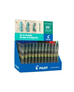 EXPOSITOR DE 60 BOLÍGRAFOS + 10 UDS DE B2P TINTA DE GEL DE REGALO. 60 BOLÍGRAFOS DE TINTA BASE DE ACEITE DE 1.0 MM. RETRÁCTIL. RECARGABLE. REALIZADO CON MATERIALES RECICLADOS EN UN 86% PRINCIPALMENTE DE BOTELLAS RECUPERADAS DE MARES Y OCÉANOS. CON UN DISEÑO SIMILAR A UNA BOTELLA DE PLÁSTICO. TINTA DE GRAN SUAVIDAD QUE PERMITE UNA INCREIBLE SENSACION DE ESCRITURA. COMPOSICIÓN DEL EXPOSITOR: 25 AZULES, 20 NEGROS, 10 ROJOS Y 5 VERDES.