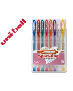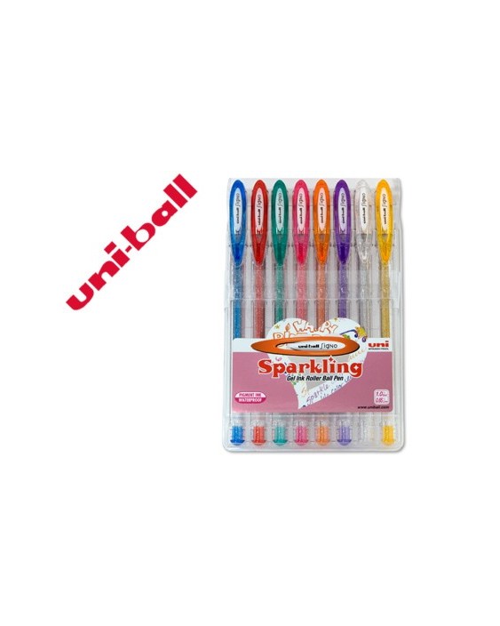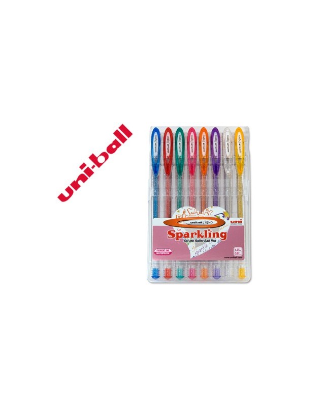 Tinta gel. Punta de acero inoxidable. Cuerpo de plástico. Clip exclusivo uni-ball. Amplia gama de colores junto a un excelente diseño. Tinta pigmentada resistente al agua y a la luz. Tiene una duración de 5 años. Punta de 0,7 mm. Trazo de 0,4 mm. Contiene 8 bolígrafos de colores surtidos.