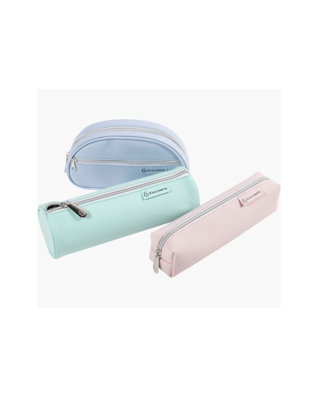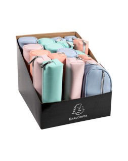 Aquarel una gama de colores pastel pantones especiales. Portatodo Aquarel de tacto suave, forrada de poliéster. Surtido en 3 formas. Forma redonda: 22,5x7,5cm Forma cuadrada: 22,5x5cm. Forma ovalada: 19,2x5x11,5cm. El expositor se compone de 6 redondos, 6 cuadrados, 6 ovalos. Colores surtidos : Azul, Coral, Rosa y Verde. La caja expositor contiene 18 portatodos con unmismo codigo de barra unitario para vender todos los portatodos al mismo precio unitario.