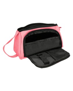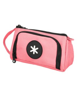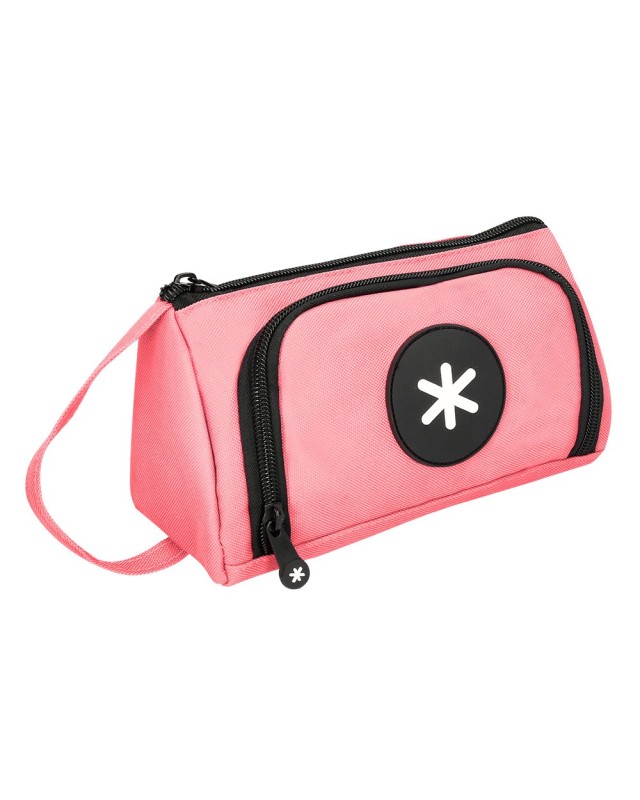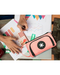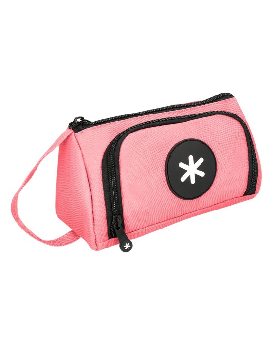 Bolso escolar portatodo Antartik con compartimento principal de gran formato con cremallera,bolsillos interiores laterales, solapa frontal con cremallera con acceso al interior. La solapa contiene 4 elásticos para boligrafos, subrayadores y grafito, y un bolsillo de red. Asa lateral. Color coral.