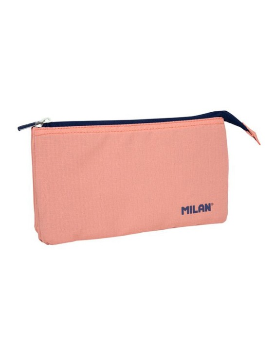 Estuche portatodo con 2 cremalleras y 5 compartimentos, para poder organizar y repartir el contenido. Serie 1918, color rosa. Inspirada en los colores y diseño originales de las gomas de borrar Milan, fabricadas en España desde 1918. Forro interior estampado azul marino con una cuadrícula que evoca las formas de las gomas Milan. Tejido exterior 'ripstop': ligero y resistente a la rotura y rasgaduras. Utiliza una técnica especial que teje hilos gruesos de refuerzo a intervalos regulares en un patrón entrecruzado. Composición tejido: exterior y forro interior de poliéster. Medidas: 22x12x4 cm.