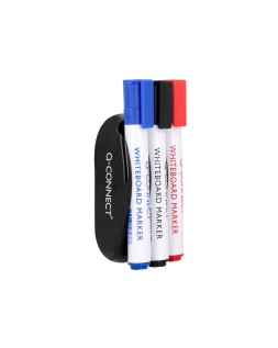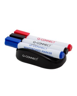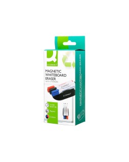 Borrador magnético pizarra blanca compacto y manejable. Fabricado en plástico de color negro, dispone de 3 huecos para poner los rotuladores de pizarra. Se desliza sin esfuerzos sobre la superficie y se adhiere a ella gracias a su imán. Con 3 rotuladores en color negro, azul y rojo incorporados.Medidas: 148 x 70 x 50 mm.