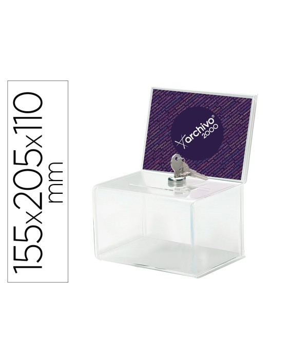 Buzón de sugerencias con llave y con espacio personalizable en la parte trasera. Parte trasera para folletos de medidas 15,2 x 10,2 cm. Fabricado en poliestireno transparente de gran resistencia. Ideal para las tarjetas de visita, monedas, billetes de rifa, formularios, etc. Incluye dos llaves. Espacio interior: 15,2 x 10,2 cm. Medidas ranura: 8,9 x 0,64 cm. Medidas: 15,5 x 20,5 x 11 cm.