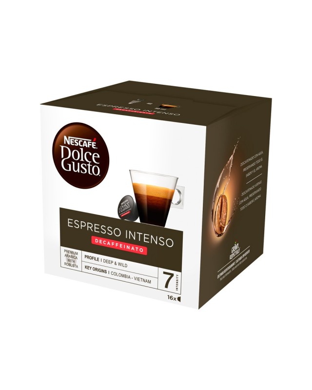Cápsulas Espresso Nescafé Dolce Gusto Descafeinado intenso selección arábica y robusta de Colombia y Vietnam. Intensidad 7. La mejor manera de saborear un espresso 100% arábica sin cafeína. Intenso aroma manteniendo todo su cuerpo y sabor gracias al proceso natural de descafeinización con agua. Sólo válida para las máquinas de café Dolce Gusto. Caja de 16 unidades.