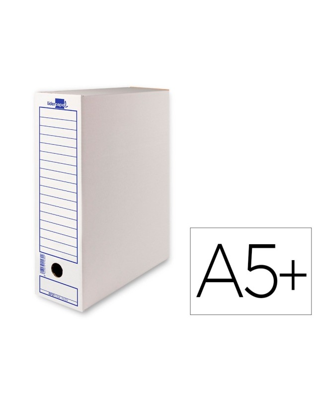 Caja de archivo definitivo para almacenar, organizar y proteger documentosy facturas tamaño cuarto. Con sistema de montaje manual muy simple. Fabr icada con cartón ondulado 100% reciclado y reciclable de 325g/m². Esta caja de archivo definitivo en color blanco tiene un lomo de 105 mm y sus medidas son 278x105x213 mm. Con ollao lateral y frontal acompañado de 2 zonasamplías de etiquetaje que permiten almacenarlas tanto en posición vertica l como horizontal. Esta caja de archivo definitivo te permitirá conservar tus documentos de forma ordenada al mismo tiempo que ahorrarás espacio, siendo así mucho más eficiente su almacenamiento.
