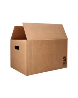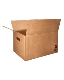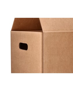 Caja para embalar y mudanzas americana. Con asas en los laterales para quepuedas moverlas de forma cómoda y sin riesgo de corte. Ideal tanto para e mbalaje y mudanzas como para envíos e-commerce y online de todo tipo de productos. También para almacenar gracias a que se pueden apilar una encima de otra. Plegable de cuatro caras laterales y base rectangular que se cierra tanto en su parte inferior como en su parte superior por medio de 4 solapas. Las solapas más largas cierran al centro, sin dejar espacio para quese escape el contenido. Fabricada en cartón 100% reciclado y reciclable d e canal simple de 5 mm de espesor. Esta caja para envíos en colo r kraft tiene unas medidas de 400x290x220 mm. Con capacidad para 25 litros.