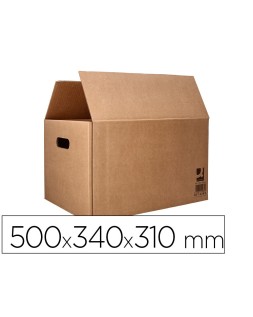 Caja para embalar y mudanzas americana. Caja ultrarresistente con doble canal para envíos pesados. Con asas en los laterales para que puedas moverlas de forma cómoda y sin riesgo de corte. Ideal tanto para embalaje y mudanzas como para envíos e-commerce y online de todo tipo de productos. También para almacenar gracias a que se pueden apilar una encima de otra. Plegable de cuatro caras laterales y base rectangular que se cierra tanto en su parte inferior como en su parte superior por medio de 4 solapas. Las solapas más largas cierran al centro, sin dejar espacio para que se escape el contenido. Fabricada en cartón 100% reciclado y reciclable de canal doble de 7 mm de espesor. Esta caja para envíos en color kraft tiene un as medidas de 500x340x310 mm. Con capacidad para 52